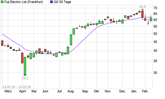 Mit dem Rücksetzer auf 62,50 EUR hat die Fuji Electric-Aktie am 12.02.2026 die 50-Tage-Linie nach unten gekreuzt.
