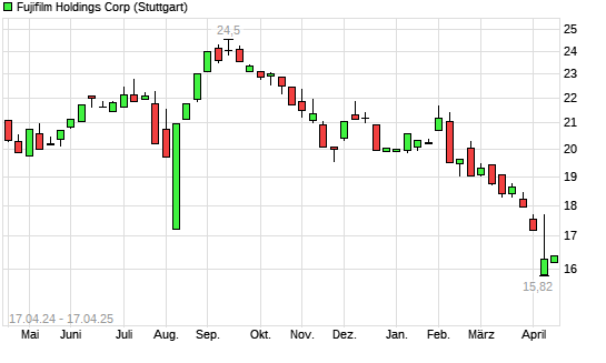Mit dem Rücksetzer auf 16,12 EUR hat die Fuji Film-Aktie (ISIN JP3814000000) am 16.04.2025 ein neues 12-Monats-Tief erreicht und damit den Kurs vom 11.04.2025 eingestellt.
