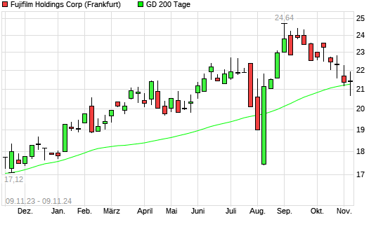 Mit dem Anstieg auf 21,39 EUR hat die Fuji Film-Aktie am 08.11.2024 die 200-Tage-Linie nach oben gekreuzt.
