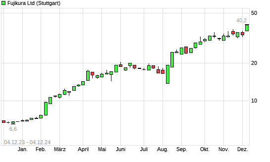 Mit dem Anstieg auf 39,00 EUR hat die Fujikura-Aktie (ISIN JP3811000003) am 03.12.2024 ein neues All-Time-High erreicht und damit den Kurs vom 02.12.2024 eingestellt.