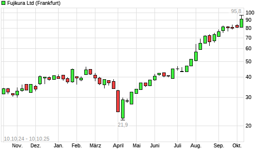Mit dem Anstieg auf 95,60 EUR hat die Fujikura-Aktie (ISIN JP3811000003) am 09.10.2025 ein neues All-Time-High erreicht und damit den Kurs vom 08.10.2025 eingestellt.