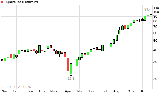 Mit dem Anstieg auf 99,40 EUR hat die Fujikura-Aktie (ISIN JP3811000003) am 20.10.2025 ein neues All-Time-High erreicht und damit den Kurs vom 16.10.2025 eingestellt.