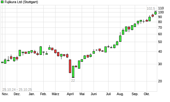 Mit dem Anstieg auf 102,00 EUR hat die Fujikura-Aktie (ISIN JP3811000003) am 24.10.2025 ein neues All-Time-High erreicht und damit den Kurs vom 20.10.2025 eingestellt.
