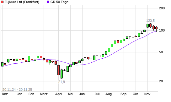 Mit dem Anstieg auf 102,00 EUR hat die Fujikura-Aktie am 19.11.2025 die 50-Tage-Linie nach oben gekreuzt.