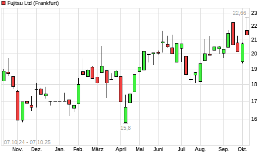 Mit dem Anstieg auf 22,30 EUR hat die Fujitsu-Aktie (ISIN JP3818000006) am 06.10.2025 ein neues 12-Monats-Hoch erreicht und damit den Kurs vom 15.09.2025 eingestellt.