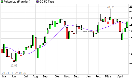 Mit dem Rücksetzer auf 17,89 EUR hat die Fujitsu-Aktie am 23.04.2025 die 50-Tage-Linie nach unten gekreuzt.