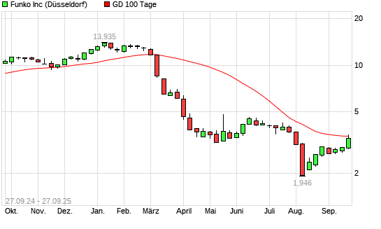 Mit dem Rücksetzer auf 3,34 EUR hat die Funko-Aktie am 26.09.2025 die 100-Tage-Linie nach unten gekreuzt.