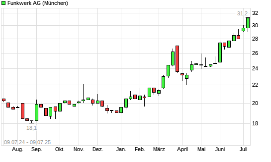 Mit dem Anstieg auf 31,30 EUR hat die Funkwerk-Aktie (ISIN DE0005753149) am 08.07.2025 ein neues 3-Jahres-Hoch erreicht und damit den Kurs vom 07.07.2025 eingestellt.