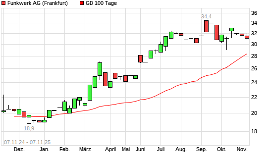 Mit dem Rücksetzer auf 31,00 EUR hat die Funkwerk-Aktie am 06.11.2025 die 100-Tage-Linie nach unten gekreuzt.