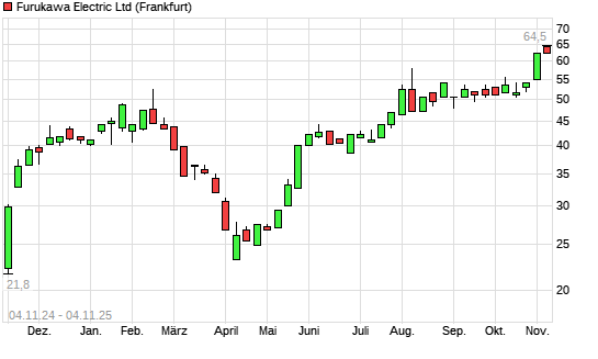 Mit dem Anstieg auf 64,00 EUR hat die Furukawa Electric-Aktie (ISIN JP3827200001) am 03.11.2025 ein neues 10-Jahres-Hoch erreicht und damit den Kurs vom 31.10.2025 eingestellt.