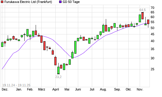 Mit dem Rücksetzer auf 52,00 EUR hat die Furukawa Electric-Aktie am 18.11.2025 die 50-Tage-Linie nach unten gekreuzt.