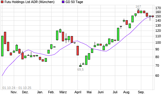Mit dem Rücksetzer auf 146,00 EUR hat die Futu Holdings ADR-Aktie am 30.09.2025 die 50-Tage-Linie nach unten gekreuzt.