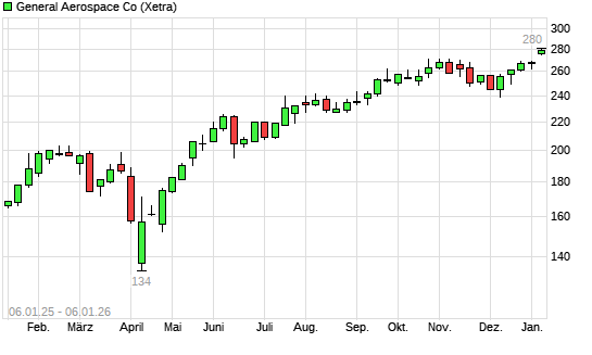 Mit dem Anstieg auf 281,50 EUR hat die GE Aerospace (ex General Electric)-Aktie (ISIN US3696043013) am 05.01.2026 ein neues 10-Jahres-Hoch erreicht und damit den Kurs vom 02.01.2026 eingestellt.