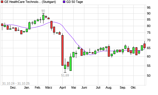 Mit dem Rücksetzer auf 63,93 EUR hat die GE Healthcare Technologies-Aktie am 30.10.2025 die 50-Tage-Linie nach unten gekreuzt.