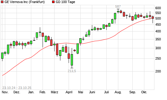 Mit dem Rücksetzer auf 485,50 EUR hat die GE Vernova-Aktie am 22.10.2025 die 100-Tage-Linie nach unten gekreuzt.