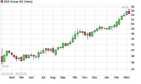 Mit dem Anstieg auf 56,25 EUR hat die GEA Group-Aktie (ISIN DE0006602006) am 03.03.2025 ein neues 10-Jahres-Hoch erreicht und damit den Kurs vom 26.02.2025 eingestellt.