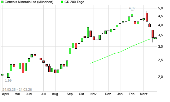 Mit dem Anstieg auf 3,30 EUR hat die GENESIS MINERALS-Aktie am 23.03.2026 die 200-Tage-Linie nach oben gekreuzt.