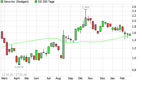 Mit dem Anstieg auf 1,55 EUR hat die GEVO-Aktie am 16.02.2026 die 200-Tage-Linie nach oben gekreuzt.