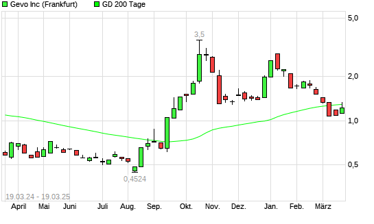 Mit dem Rücksetzer auf 1,28 EUR hat die GEVO-Aktie am 18.03.2025 die 200-Tage-Linie nach unten gekreuzt.