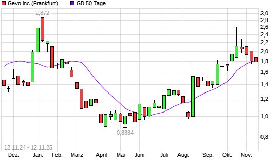 Mit dem Rücksetzer auf 1,80 EUR hat die GEVO-Aktie am 11.11.2025 die 50-Tage-Linie nach unten gekreuzt.Die GEVO-Aktie befindet sich seit dem 12.08.2025 im langfristigen Aufwärtstrend und ...weiterlesen