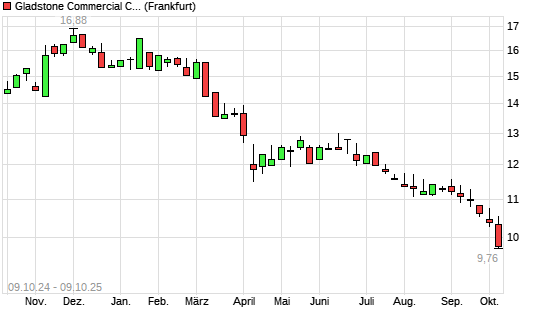 Mit dem Rücksetzer auf 9,90 EUR hat die GLADSTONE COMMERCIAL CORPORATI-Aktie (ISIN US3765361080) am 08.10.2025 ein neues 5-Jahres-Tief erreicht und damit den Kurs vom 07.10.2025 eingestellt.