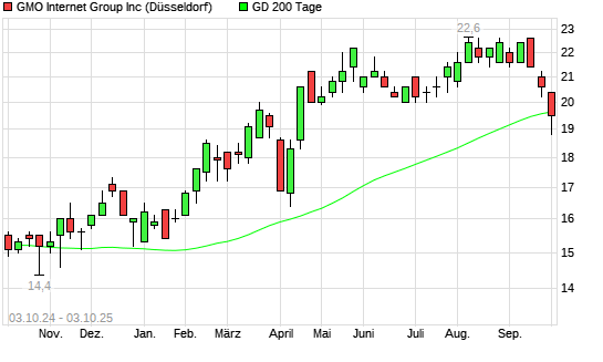 Mit dem Rücksetzer auf 19,40 EUR hat die GMO INTERNET-Aktie am 02.10.2025 die 200-Tage-Linie nach unten gekreuzt.