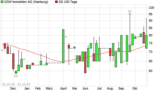 Mit dem Anstieg auf 92,00 EUR hat die GSW Immobilien-Aktie am 30.10.2024 die 100-Tage-Linie nach oben gekreuzt.
