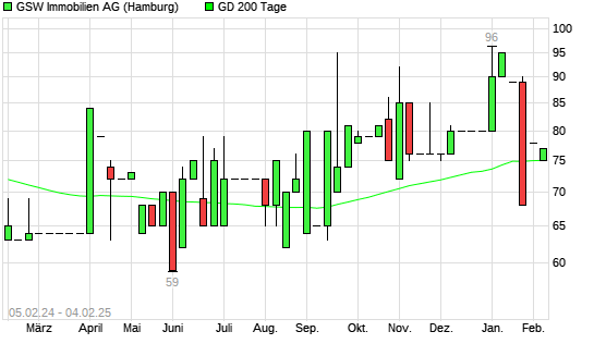 Mit dem Rücksetzer auf 75,00 EUR hat die GSW Immobilien-Aktie am 03.02.2025 die 200-Tage-Linie nach unten gekreuzt.