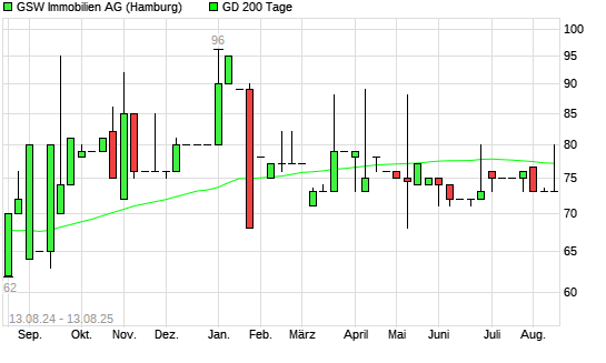 Mit dem Rücksetzer auf 73,00 EUR hat die GSW Immobilien-Aktie am 12.08.2025 die 200-Tage-Linie nach unten gekreuzt.