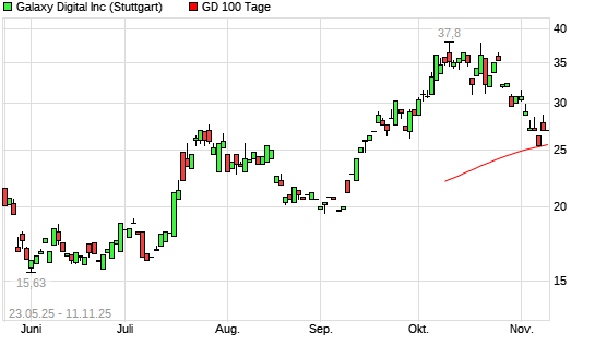 Mit dem Anstieg auf 27,60 EUR hat die Galaxy Digital-Aktie am 10.11.2025 die 100-Tage-Linie nach oben gekreuzt.