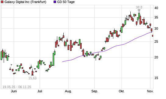 Mit dem Rücksetzer auf 26,80 EUR hat die Galaxy Digital-Aktie am 05.11.2025 die 50-Tage-Linie nach unten gekreuzt.