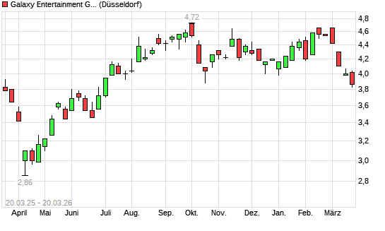 Mit dem Rücksetzer auf 3,86 EUR hat die Galaxy Entertainment-Aktie (ISIN HK0027032686) am 19.03.2026 ein neues 6-Monats-Tief erreicht und damit den Kurs vom 14.10.2025 eingestellt.