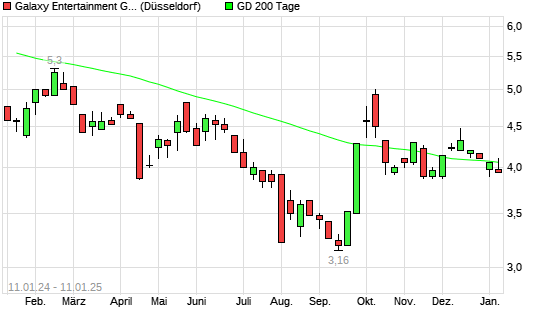 Mit dem Rücksetzer auf 4,00 EUR hat die Galaxy Entertainment-Aktie am 10.01.2025 die 200-Tage-Linie nach unten gekreuzt.