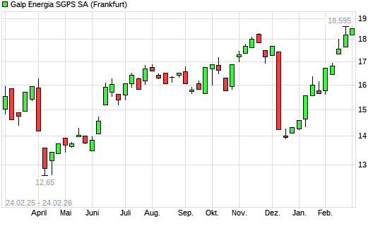 Mit dem Anstieg auf 18,40 EUR hat die Galp Energia-Aktie (ISIN PTGAL0AM0009) am 23.02.2026 ein neues 12-Monats-Hoch erreicht und damit den Kurs vom 18.11.2025 eingestellt.