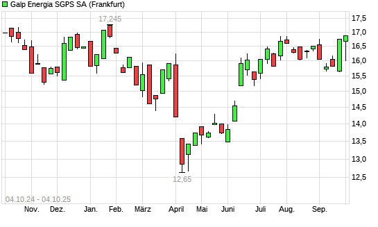 Mit dem Anstieg auf 16,86 EUR hat die Galp Energia-Aktie (ISIN PTGAL0AM0009) am 03.10.2025 ein neues 6-Monats-Hoch erreicht und damit den Kurs vom 30.07.2025 eingestellt.