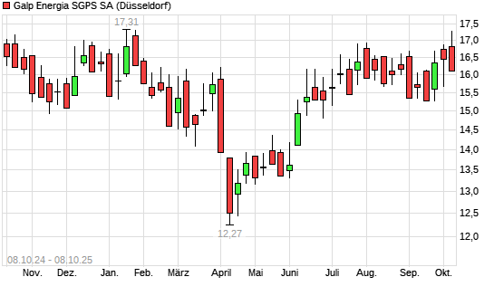 Mit dem Anstieg auf 17,16 EUR hat die Galp Energia-Aktie (ISIN PTGAL0AM0009) am 07.10.2025 ein neues 6-Monats-Hoch erreicht und damit den Kurs vom 03.10.2025 eingestellt.