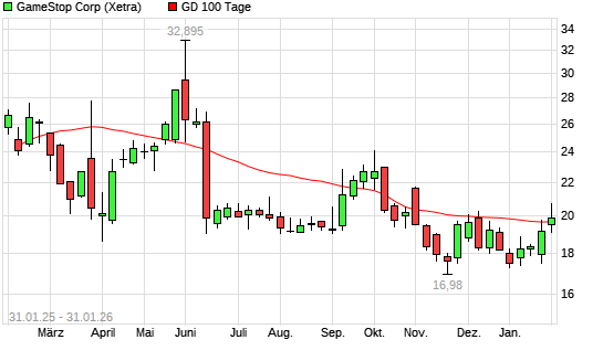 Mit dem Anstieg auf 19,82 EUR hat die GameStop-Aktie am 30.01.2026 die 100-Tage-Linie nach oben gekreuzt.
