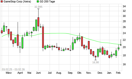 Mit dem Anstieg auf 21,99 EUR hat die GameStop-Aktie am 02.02.2026 die 200-Tage-Linie nach oben gekreuzt.