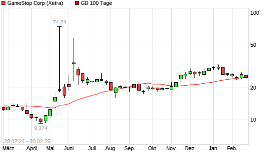 Mit dem Rücksetzer auf 24,90 EUR hat die GameStop-Aktie am 19.02.2025 die 100-Tage-Linie nach unten gekreuzt.