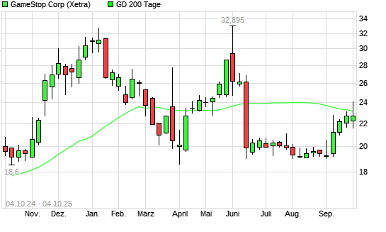 Mit dem Rücksetzer auf 22,20 EUR hat die GameStop-Aktie am 03.10.2025 die 200-Tage-Linie nach unten gekreuzt.