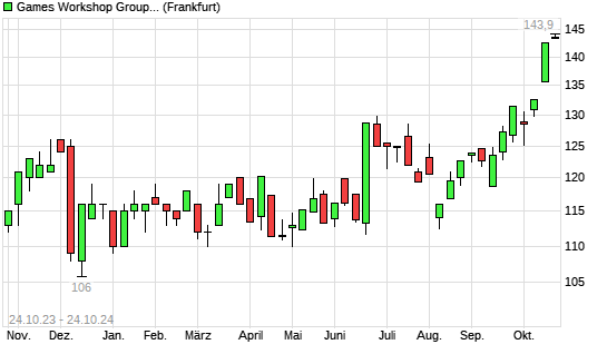 Mit dem Anstieg auf 143,90 EUR hat die Games Workshop Group-Aktie (ISIN GB0003718474) am 23.10.2024 ein neues All-Time-High erreicht und damit den Kurs vom 22.10.2024 eingestellt.