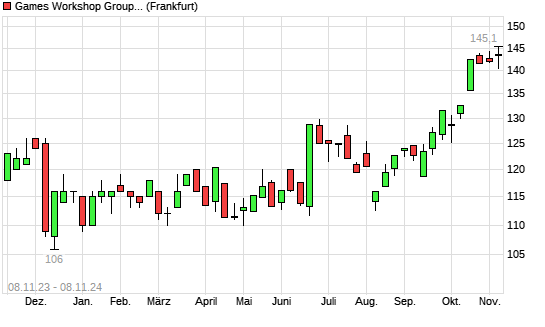Mit dem Anstieg auf 145,10 EUR hat die Games Workshop Group-Aktie (ISIN GB0003718474) am 07.11.2024 ein neues All-Time-High erreicht und damit den Kurs vom 29.10.2024 eingestellt.