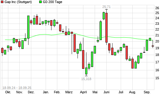 Mit dem Rücksetzer auf 19,02 EUR hat die Gap-Aktie am 17.09.2025 die 200-Tage-Linie nach unten gekreuzt.