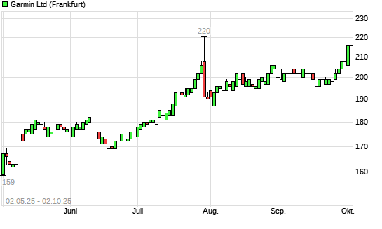 Mit dem Anstieg auf 216,00 EUR hat die Garmin-Aktie (ISIN CH0114405324) am 01.10.2025 ein neues 6-Monats-Hoch erreicht und damit den Kurs vom 30.09.2025 eingestellt.