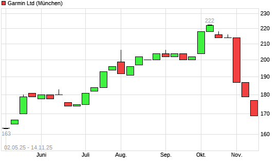 Mit dem Rücksetzer auf 166,00 EUR hat die Garmin-Aktie (ISIN CH0114405324) am 13.11.2025 ein neues 6-Monats-Tief erreicht und damit den Kurs vom 18.06.2025 eingestellt.