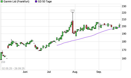 Mit dem Anstieg auf 202,00 EUR hat die Garmin-Aktie am 25.09.2025 die 50-Tage-Linie nach oben gekreuzt.