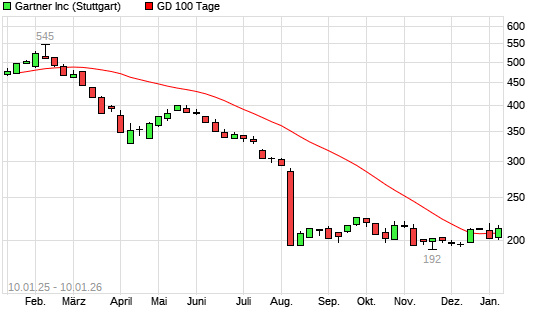 Mit dem Anstieg auf 210,40 EUR hat die Gartner-Aktie am 09.01.2026 die 100-Tage-Linie nach oben gekreuzt.