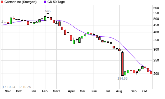 Mit dem Rücksetzer auf 202,10 EUR hat die Gartner-Aktie am 16.10.2025 die 50-Tage-Linie nach unten gekreuzt.