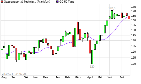 Mit dem Rücksetzer auf 163,60 EUR hat die Gaztransport & Technigaz-Aktie am 23.07.2025 die 50-Tage-Linie nach unten gekreuzt.
