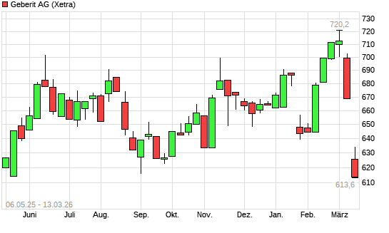Mit dem Rücksetzer auf 613,20 EUR hat die Geberit-Aktie (ISIN CH0030170408) am 12.03.2026 ein neues 6-Monats-Tief erreicht und damit den Kurs vom 26.09.2025 eingestellt.